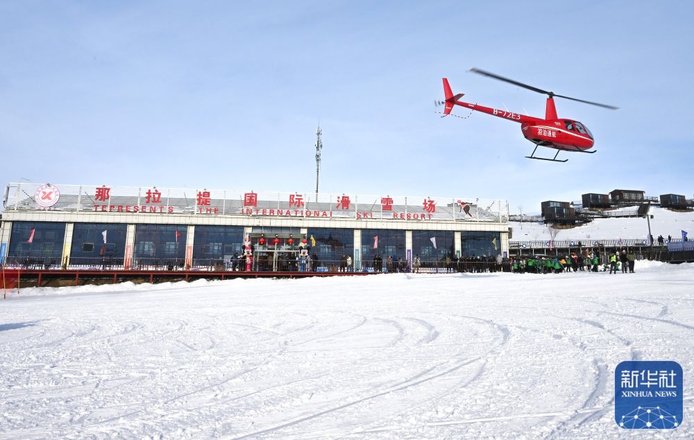 ↑那拉提国际滑雪场内树立的直升机乘坐不雅景文娱形状蛊卦搭客体验(12月21日摄)。
