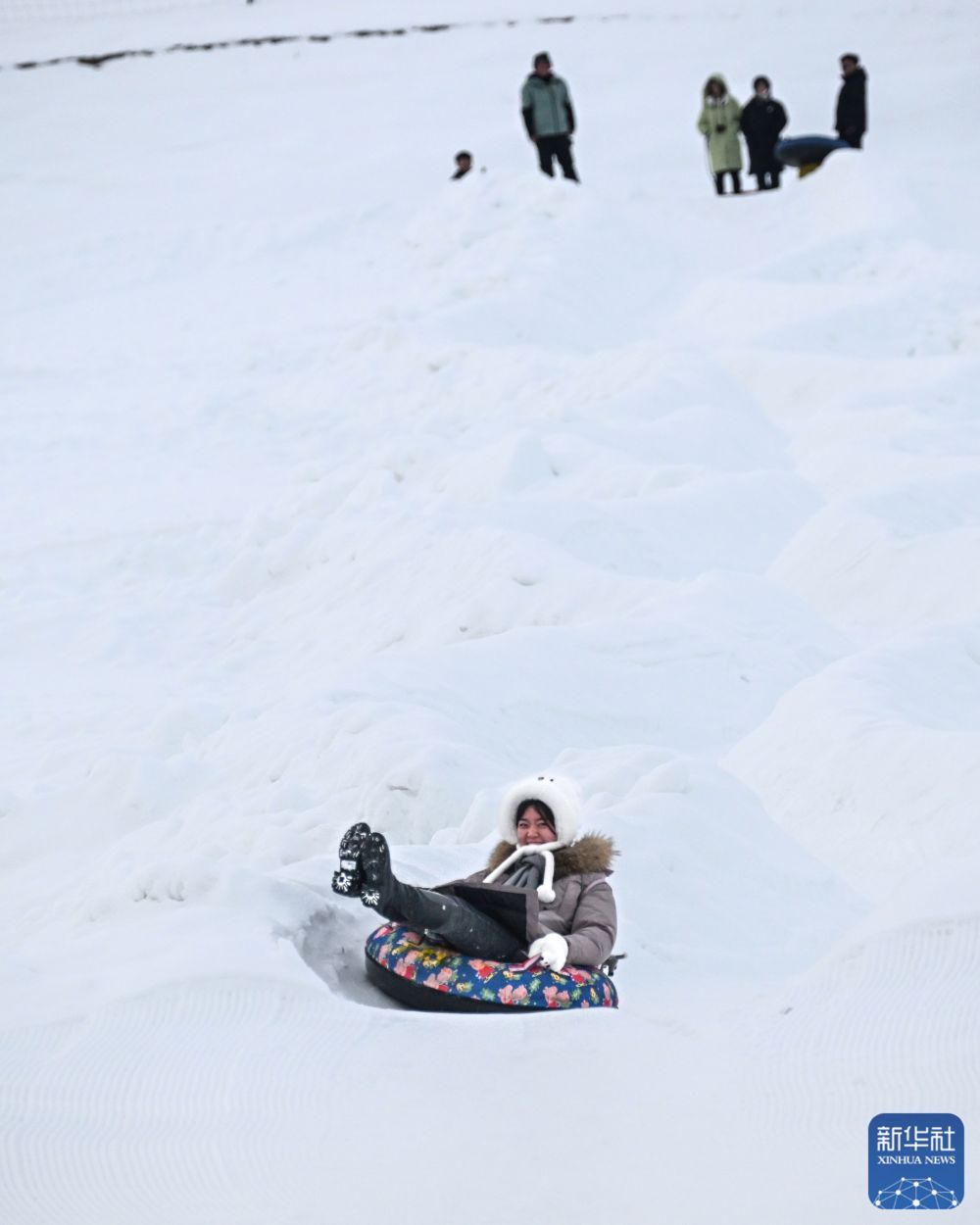 ↑12月21日,搭客在那拉提国际滑雪场体验雪上滑梯文娱形状。