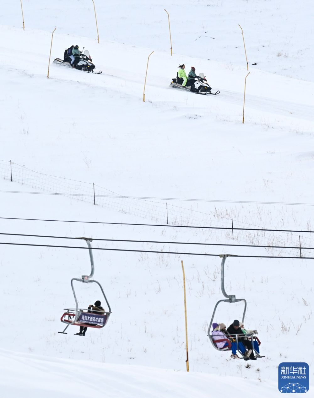 ↑12月21日,搭客在那拉提国际滑雪场体验雪上摩托(上)和索说念缆车形状。